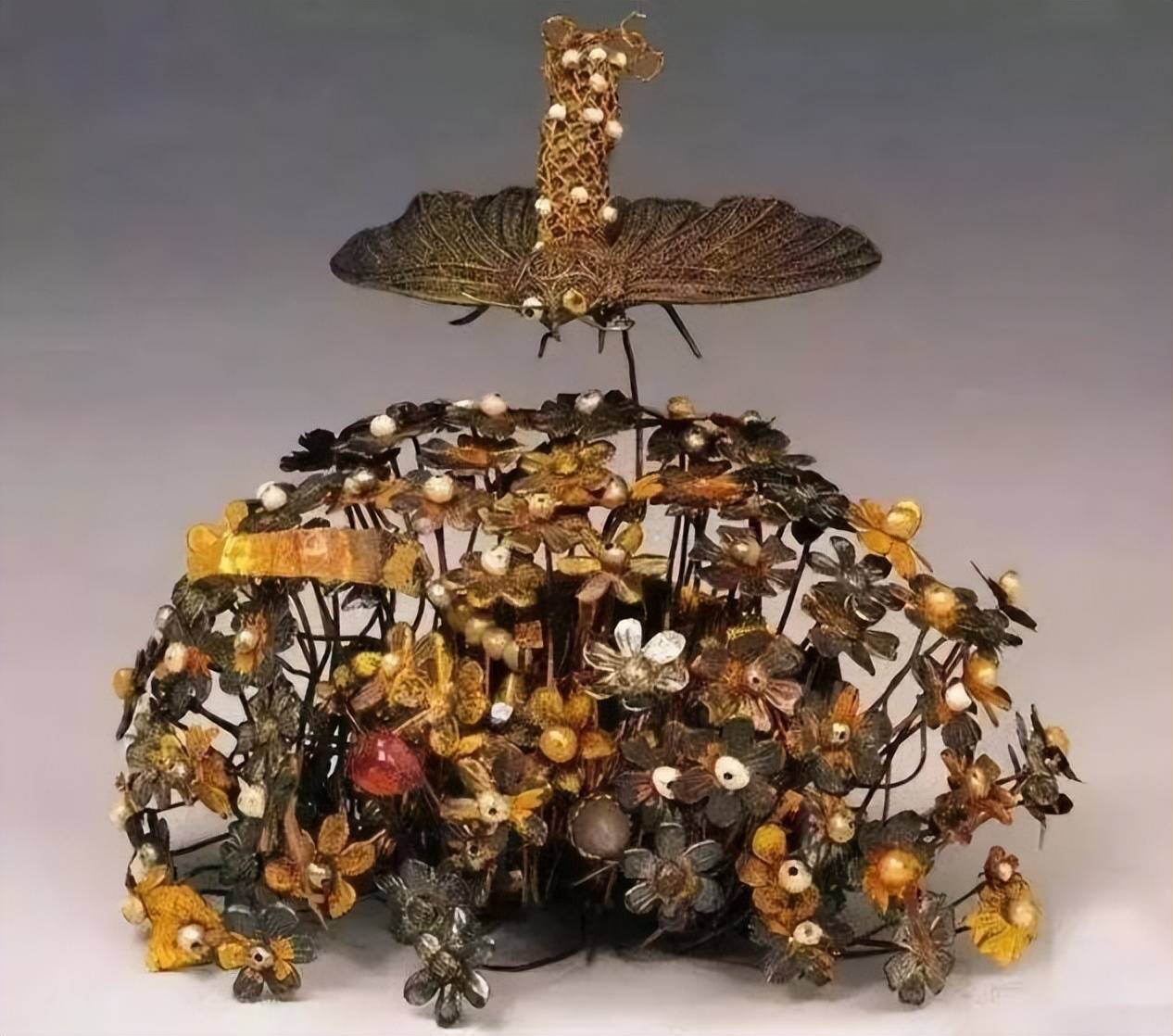 经过几百年的发展,唐朝的盛世迎来了金银工艺的新高峰。唐代的繁华与奢华,离不开金银工艺的成熟,也成为了身份和等级的象征。隋朝墓中出土的萧皇后花树冠便可见一斑。这顶花树冠是魏晋时期花树步摇的延续,经过改进发展,逐渐成为一种头冠,彰显女性的尊贵身份。