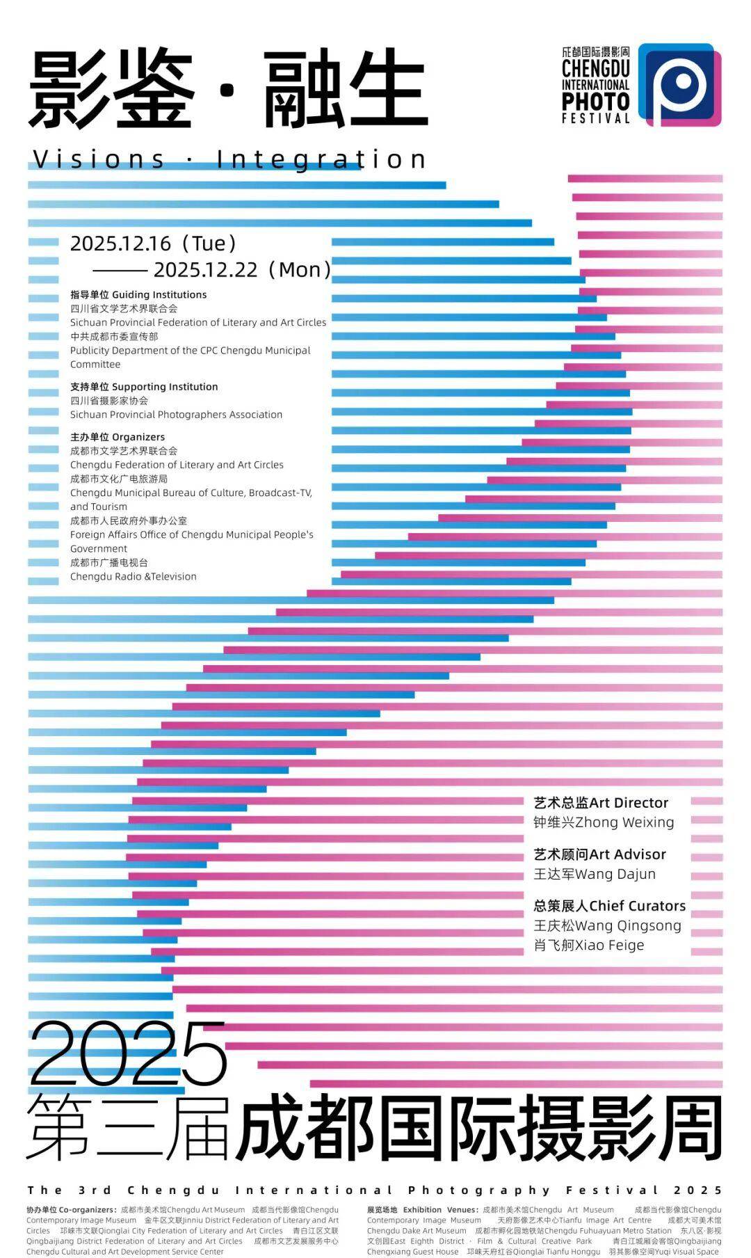 2025第三届成都国际摄影周由四川省文联、中共成都市委宣传部指导,四川省摄影家协会支持,成都市文联、成都市文广旅局、成都市外办、成都市广播电视台共同主办,主题为“影鉴·融生”。摄影周期间将推出四大主活动、十二大主体展览、六大平行展及报名展。届时,来自中国、法国、西班牙、芬兰、马来西亚等81个国家和地区的逾2000幅(组)影像作品将精彩亮相,为广大市民呈现多场极具艺术性、国际范、科技感的饕餮视觉盛宴,并将同步举办交流、大赛、研讨及分享等系列活动。