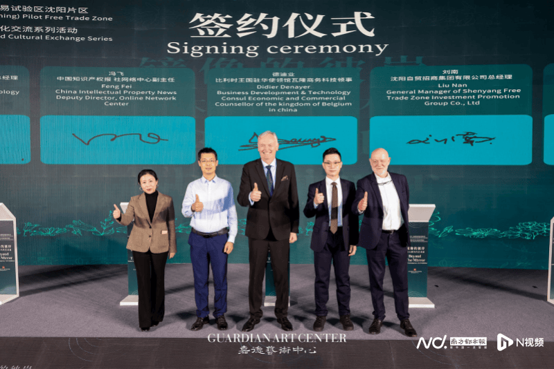 中欧经贸合作与文化交流签约仪式。(左起:辽宁易境智链科技有限公司副总经理刘一鹏,中国知识产权报、社网络中心副主任冯飞,比利时王国驻华使领馆瓦隆商务科技领事德迪业,沈阳自贸招商集团有限公司刘南,比利时列日皇家美术院院长丹尼埃尔·斯吕思)